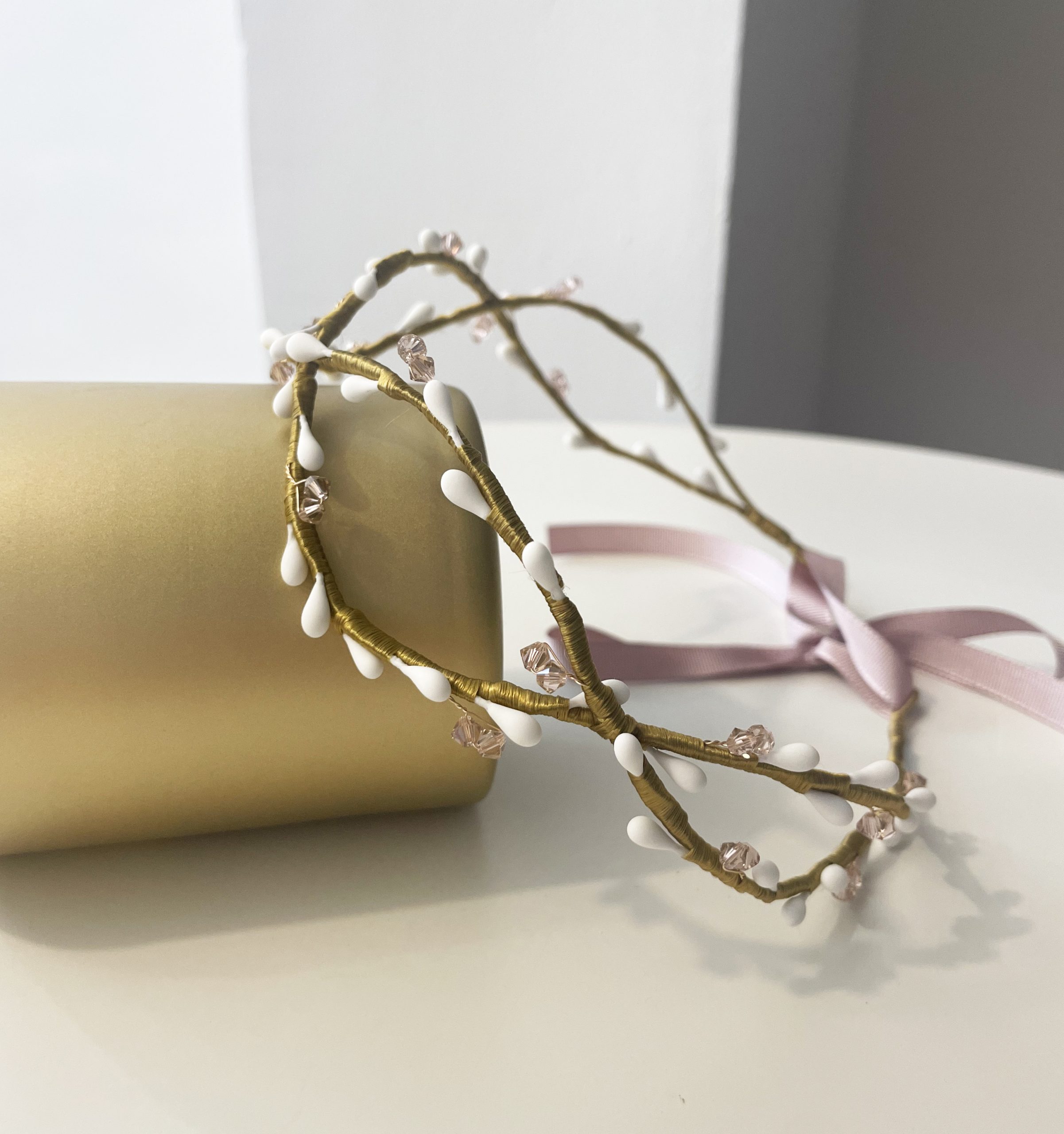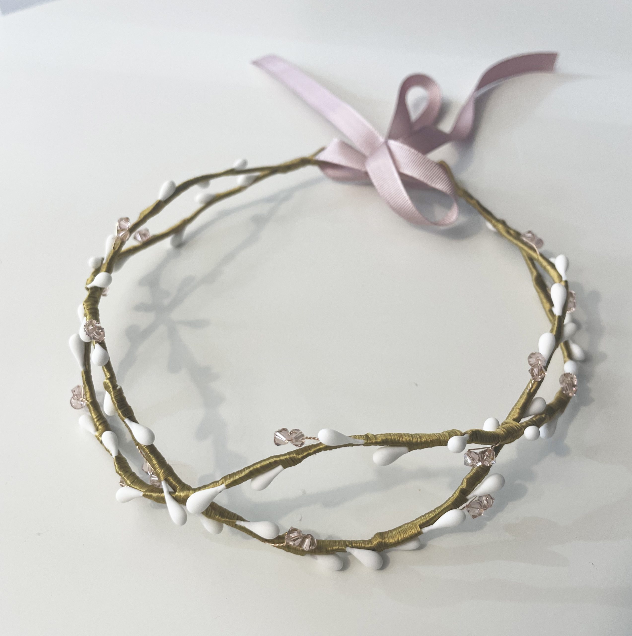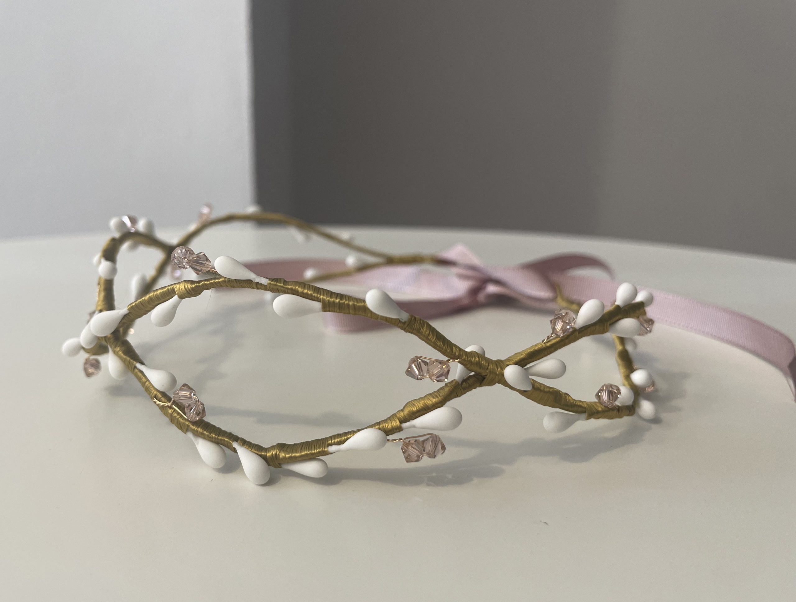 Preciosa diadema en forma cruzada, realizada con pistilos blancos y cristales de Swarovski rosa.