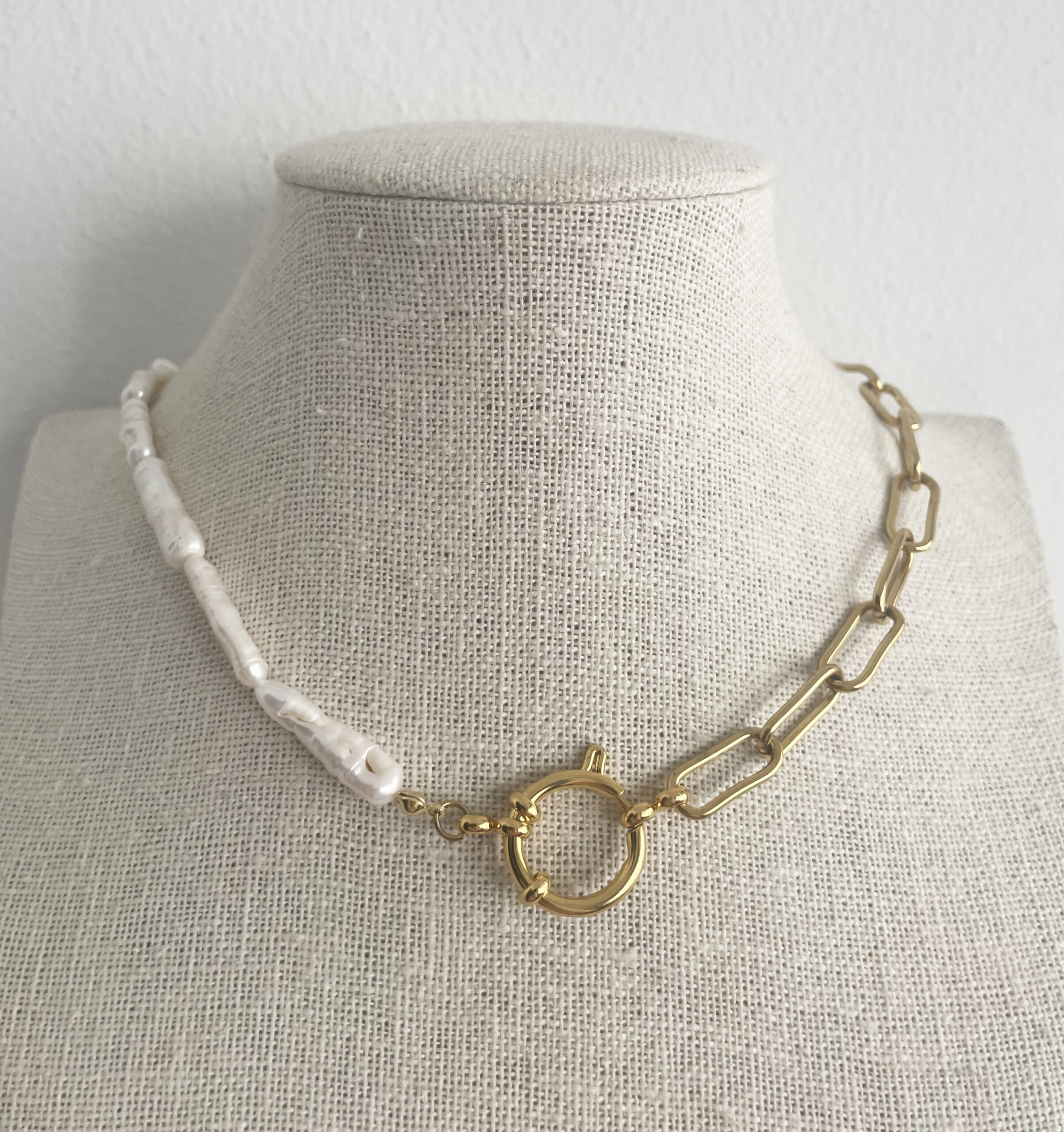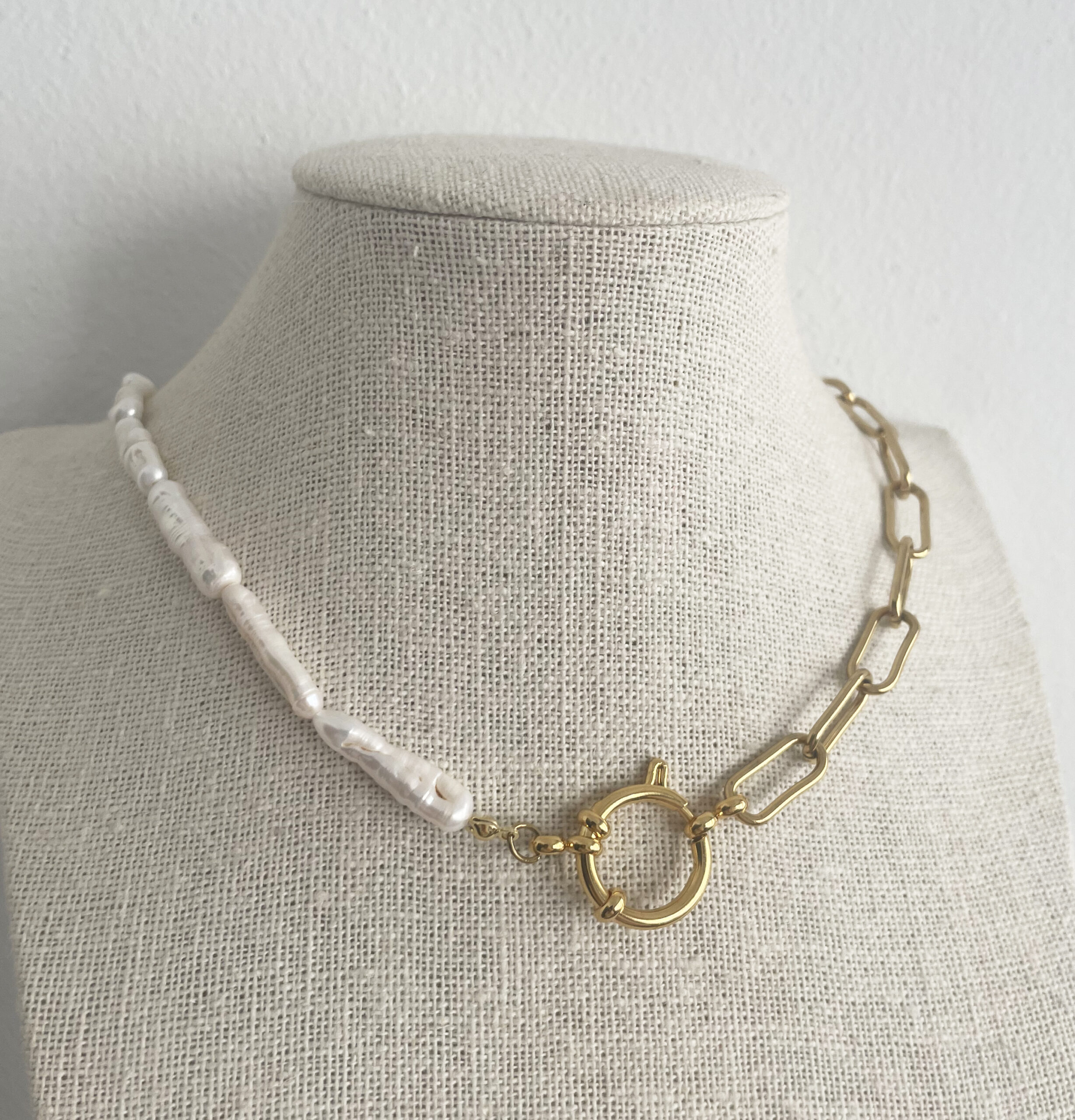 Preciosa gargantilla realizada con perlas naturales cultivadas, cadena y cierre de acero inoxidable.