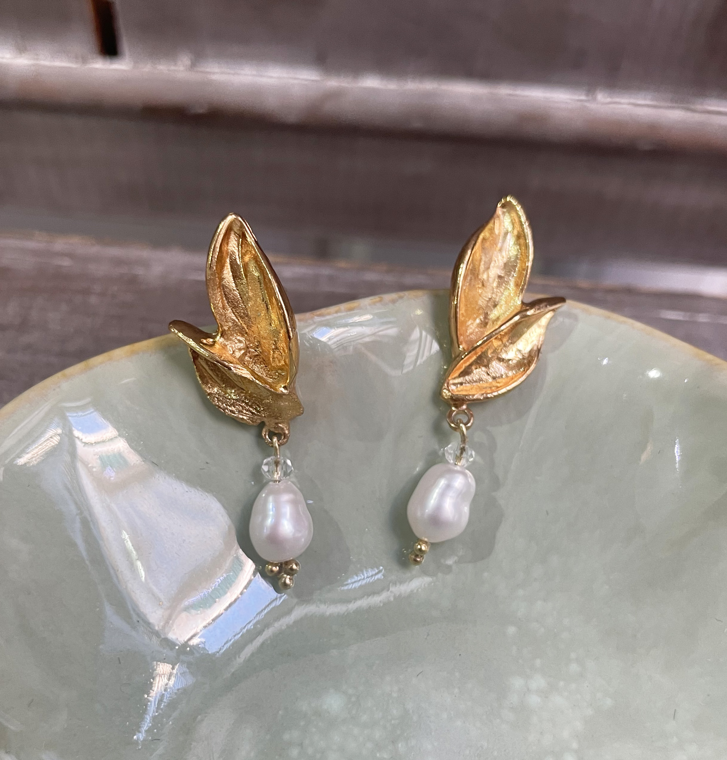 Preciosos pendientes en forma de hoja con perla natural de rio.