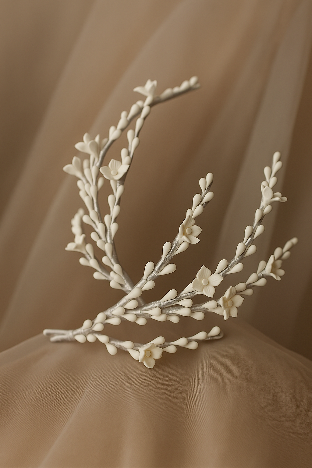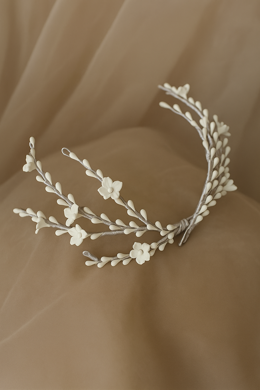 Precioso tocado gemelar, realizado con pistilos y flores de porcelana realizadas a mano en color blanco.